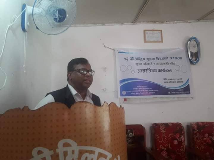 १२ औ राष्ट्रिय सूचना दिवसकाे अवसरमा आयाेजित कार्यक्रममा कार्यलयका सुचना अधिकारी सन्चारक्रमिहरुसँग भएको कार्यक्रमलाई सम्बोधन गर्दै प्रजिअ पौडेलले जति सुचना सार्वजनिक गर्न सको त्यति सुसासन कायम हुने भएकोले कुनै नागरिकलाई सुचना दिनबाट बन्चित नगराउन निर्देसन दिनु भयो ।
