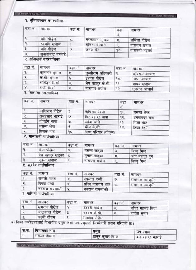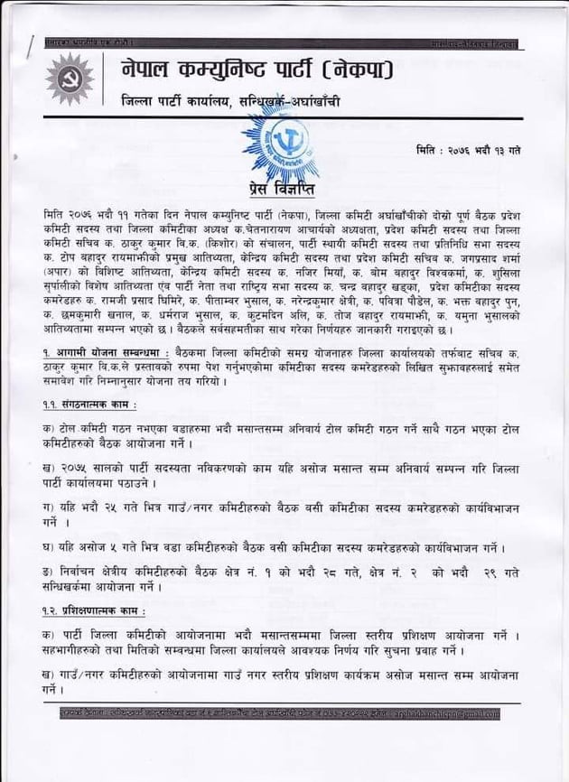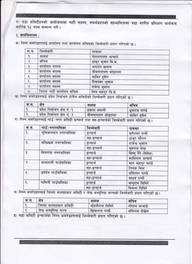बैठकले ६ वटै स्थानीय तहका ईन्चार्ज र सहईन्चार्ज, वडा इन्चार्जहरु, जिल्ला सल्लाहकार कमिटी, जेष्ठ कम्युनिष्ट मञ्च, विभागिय प्रमुख र उपप्रमुख तथा जनसंगठनको ईन्चार्ज र सहईन्चार्ज समेत तोकेको प्रचार तथा प्रकाशन विभागका प्रमुख तिलक मिश्रले जानकारी दिए ।