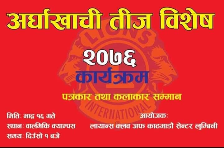 काठमाडौं । लायन्स क्लब अफ काठमाडौ सेन्टर लुम्बिनीकाे आयाेजनामा अर्घाखाँची तिज विशेष २०७६ तथा पत्रकार कलाकार सम्मान कार्यक्रम काठमाडौंकाे वाल्मीकि कलेज बागबजारमा सम्पन्न भएकाे छ ।