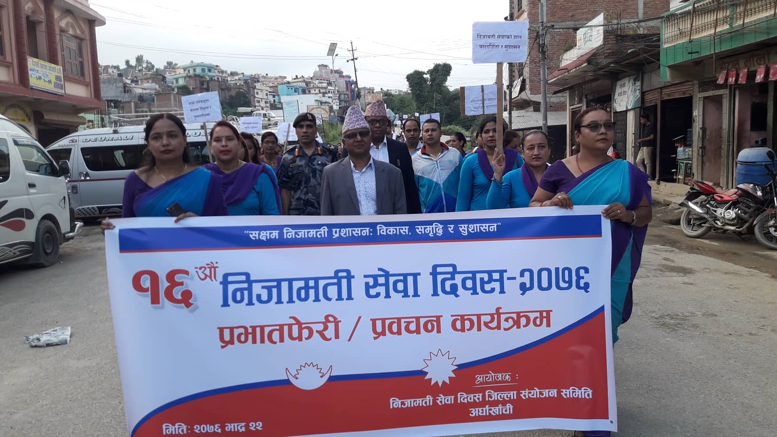निजामति सेवा दिबसको अबसरमा अायोजित कार्यक्रममा मन्तब्य राख्दै राष्ट्रिय सभाका सदस्य चन्द्रबहादुर खड्काले कर्मचारी हरुलाई मुस्कान सहितको सेवा छिटोछरितो सेवा जन्तामुखि सेवा दिन अाग्रह गर्दै कर्मचारी हरुका हक अधिकार सेवा सुबिधाका लागि सरकाले कुनै कसुर बाकि राख्न नहुने बताउनु भयो ।उहाले सरकारलाई सफल वनाउने जिम्मेवारी कर्मचारी हरुको भएको बताउदै शबै कर्मचारी हरु लाई सफलताको शुभकामना दिनु भएको थियोे ।कार्यक्रममा प्रदेस सासद रामजि घिमिरेले अर्घाखाँची जिल्ला को बिकासले तिब्रता लिएको बताउदै बजेट सहि समयमा पार्दर्सि काम गरेर खर्च गर्नु पर्नेमा जोड दिनु भयो ।उहाले जिल्ला लाई चाहिने प्रयाप्त बजेट ल्याउन प्रदेस सरकार बाट अाफुहरु सफल भएको बताउनु भयो ।