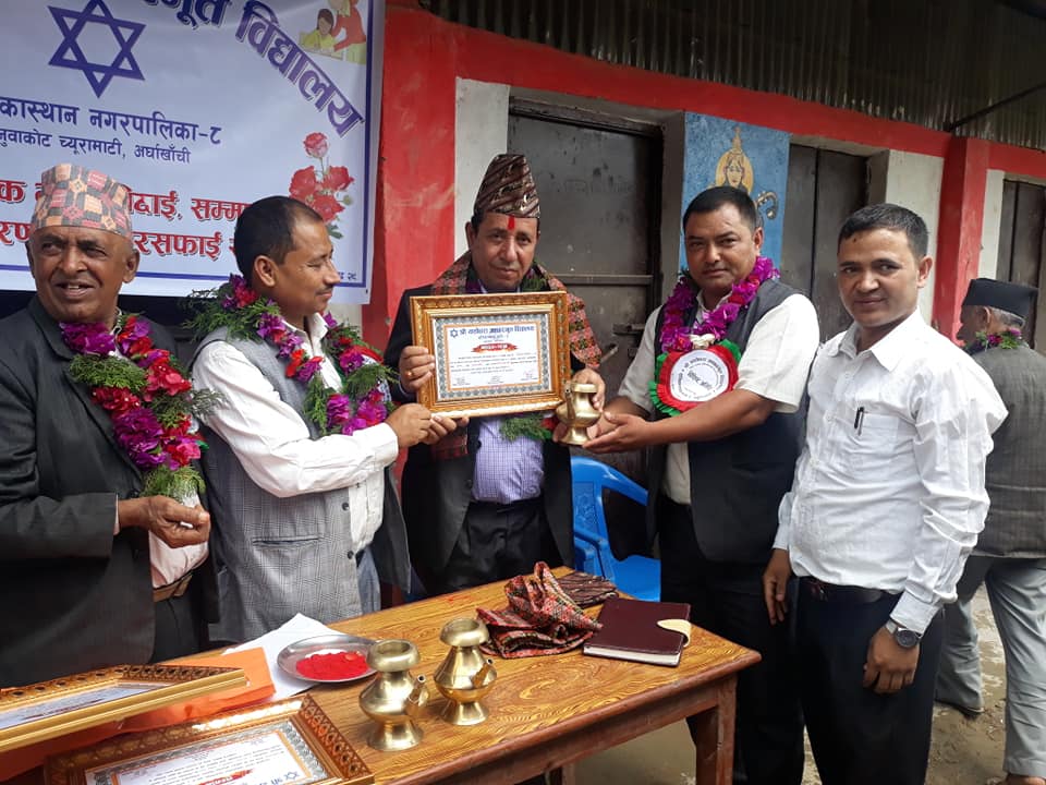 कार्यक्रममा भण्डै साडे ३ दशक अध्यापन गराई अवकास हुनुभएका शिक्षक द्वय वावुराम खनाल, राम प्रसाद गैरे र विद्यालयलाई रु. ४० हजारको फलामे गेट निर्माण गरिदिने स्थानीय समाजसेवी घनश्याम गैरेलाई प्रशंसा पत्र, काँसको करुवा, अविरमाला, खादा तथा नेपाली ढकाटोपीले सम्मान गरिएको थियो । त्यस्तै विद्यालयले कक्षा १ देखि कक्षा ८ सम्म कक्षामा प्रथम, द्वितिय, तितृय हुने विद्यार्थीहरुलाई कापी, कलम उपहार प्रदान गरि सम्मान गरेको थियो भने सोही अवसरमा स्थानीय समाजसेवी हाल बुटवल निवासी गोपाल प्रसाद गैरेले स्वर्गिय माता पिताको नाममा स्थापना गरेको भिमलाल टोपकला गैरे स्मृति अक्षय कोषवाट प्राप्त व्यजवाट कक्षा १ देखि कक्षा ८ सम्मका ८ जना जेहेन्दार छात्रछात्राहरुलाई जनही ८५० का दरले जेहेन्दार छात्रबृति पुरस्कार वितरण पनि गरिएको थियो ।