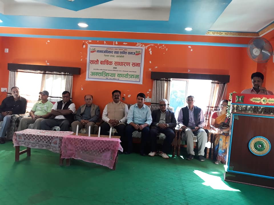 कार्यक्रम मानव अधिकार तथा शान्ति समाजका जिल्ला सभापति असोक पौडेल को अध्यक्ष ता केन्द्रीय प्रतिनिधि प्रेमनारायण आचार्यको स्वागत मन्तब्य सचिब  नेत्रप्रसाद मरासिनी को सन्चालन कमल प्रसाद भुसालको प्रमुख अतिथ्यतामा सम्पन्न भएको हो ।
