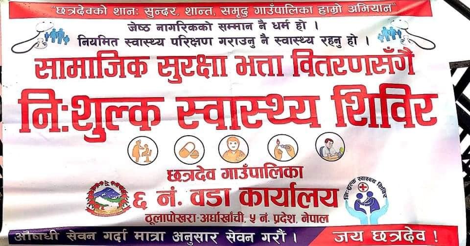 छत्रदेव । छत्रदेव गाउँपालिकाको आयोजनामा वार्ड नं. ५, ६, ७ र ८ मा सामाजिक सुरक्षा भत्तासँगै स्वास्थ्य शिविर सम्पन्न गरेको छ । आर्थिक वर्षको पहिलो चरणको कार्यक्रम अन्तर्गत गाउँपालिकाले उक्त कार्यक्रम सम्पन्न गरेको हो । सामाजिक सुरक्षा भत्तासँगै निशुल्क रुपमा स्वास्थ्य परिक्षण गर्न पाउँदा वृद्धवृद्धा, अपाङ्गता भएका व्यक्ति र असाहय बालबालिकाहरु निकै खुसी भएका छन् । स्वास्थ्य परिक्षणपछि स्थानीयहरुले निशुल्क रुपमा औषधि समेत पाएका थिए ।