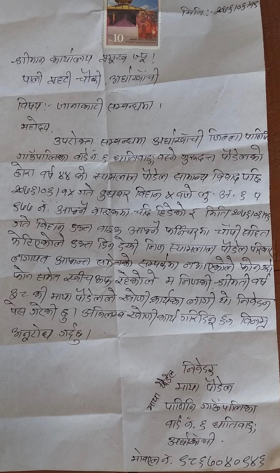 धातिवाॅङ , अर्घाखाँची पाणिनी डेक्स (अर्घाखाँची डटकम्) । पाणिनी गाँउपालिका वडा नं ६ धातिवाॅङ वाढुँङ्गा स्थित उमेश फ़र्निचर उद्योगका संचालक सेमलाल पौडेल गत ६ दिन देखी वेपत्ता हुदा गाँउ नै चिन्तित छ । साविकको धातिवाङ गाविस वडा न. ४ कोटमा २०३३ फागुन १६ गते जन्मिएका सेमलाल पौडेल अति लगनशील,मेहनती र ईमानदार पौडेल एक फ़र्निचर व्यावसायि पनि भएकोले यतिवेला फ़र्निचर उद्योग पनि ठप्प भएको हुदा दशैको मुखमा फ़र्निचर अवश्य पर्ने सेवाग्राही समेत चिन्तित छन ।