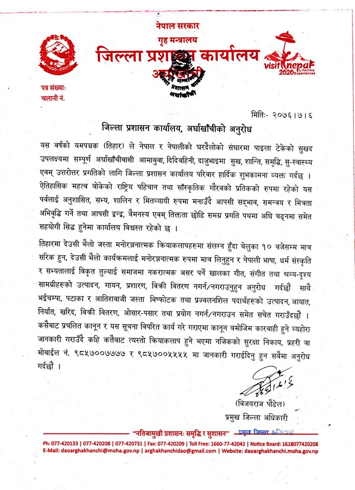 प्रमुख जिल्ला अधिकारी विजयराज पौडेलका अनुसार, ‘तिहारमा कुनै किसिमका आतिसबाजी, पटका, भूइँचम्पा लगायतको विस्फोटक पदार्थ उत्पादन, भण्डारण, बिक्री वितरण गर्न र राती १० बजेपछि देउसी भैलो खेल्न पाइने छैन ।’