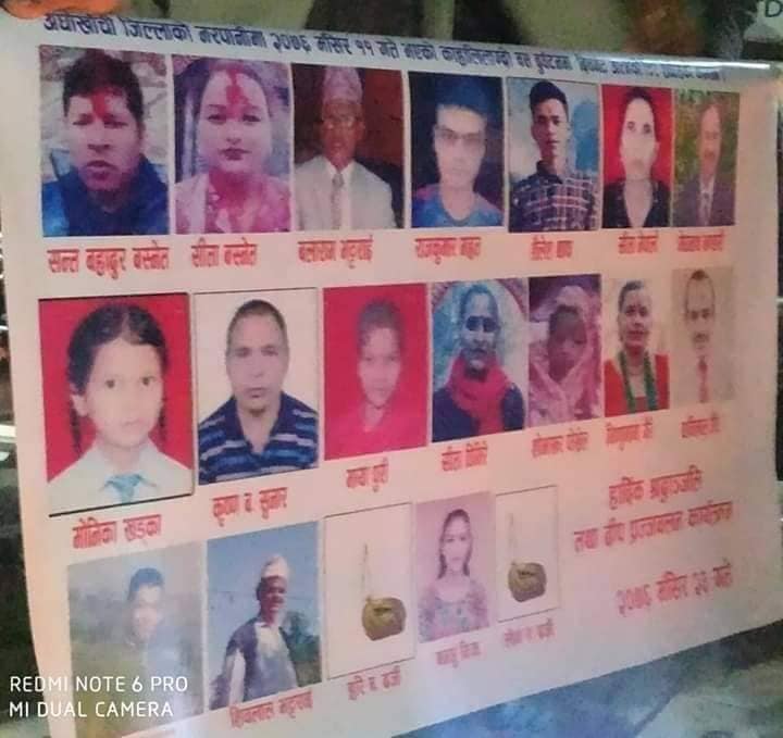 कार्यक्रममा मृतकहरु सबैको आत्माको चीर शान्तिको कामना गरिएको थियो । बस दुर्घटनामा ज्यान गुमाएका व्यक्तिहरूको १३ औं दिनको पुण्य तिथिमा दीप प्रज्वलन कार्यक्रम गरिएको हो । बस दुर्घटनामा परी १९ जनाको ज्यान गएको थियो भने १८ जना घाइते भएका थिए । घाइतेहरुको रुपन्देही र काठमाडौंमा उपचार भइरहेको छ । यता जिल्ला प्रशासन कार्यालय अर्घाखाँचीले सन्धिखर्कमा भएको बस दुर्घटना र समग्र जिल्लाको यातायात व्यवस्था सुधारसम्बन्धी ९ सदस्यीय छानबिन समिति मंसिर १३गते गठन गरेको थियो ।