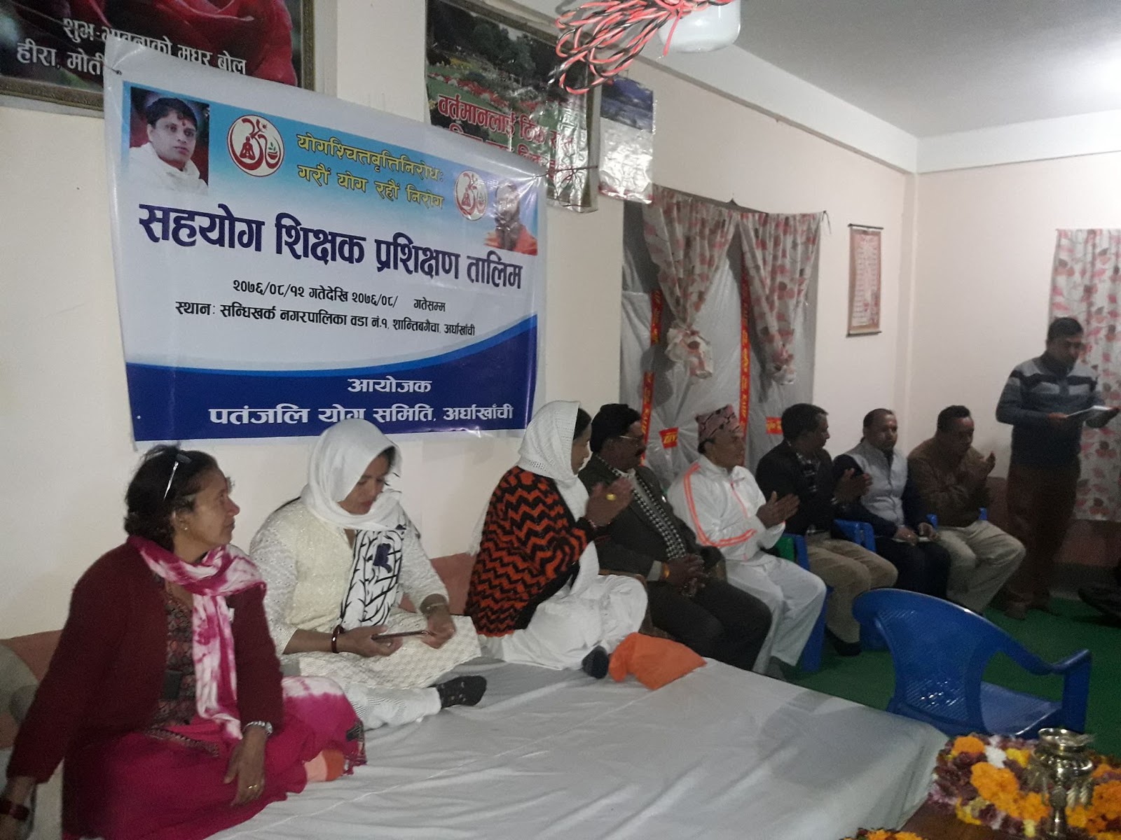 कार्यक्रम पतनजलि योग समिति का जिल्ला अध्यक्ष प्रेमनारायण पोख्रेल क‍ो अध्यक्ष ता युवा प्रभारि समाजसेवि सन्धिखर्क नगरसभा सदस्य लक्ष्मण पराजुलि को सन्चालन प्रभारि पुस्पा न्यौपाने को स्वागत मन्तब्य मा सम्पन्न कार्यक्रममा   सहभागी को तर्फबाट बोम बहादुर महत सिता श्रेष्ठ लगाएतले मन्तब्य राख्नु भएको थियोे । कार्यक्रम मा प्रकास भुसाल डिलाराम भुसाल मनिराम अर्याल  लगाएत योग प्रेमिहरु को सहभागी ता रहेको थियोे ।