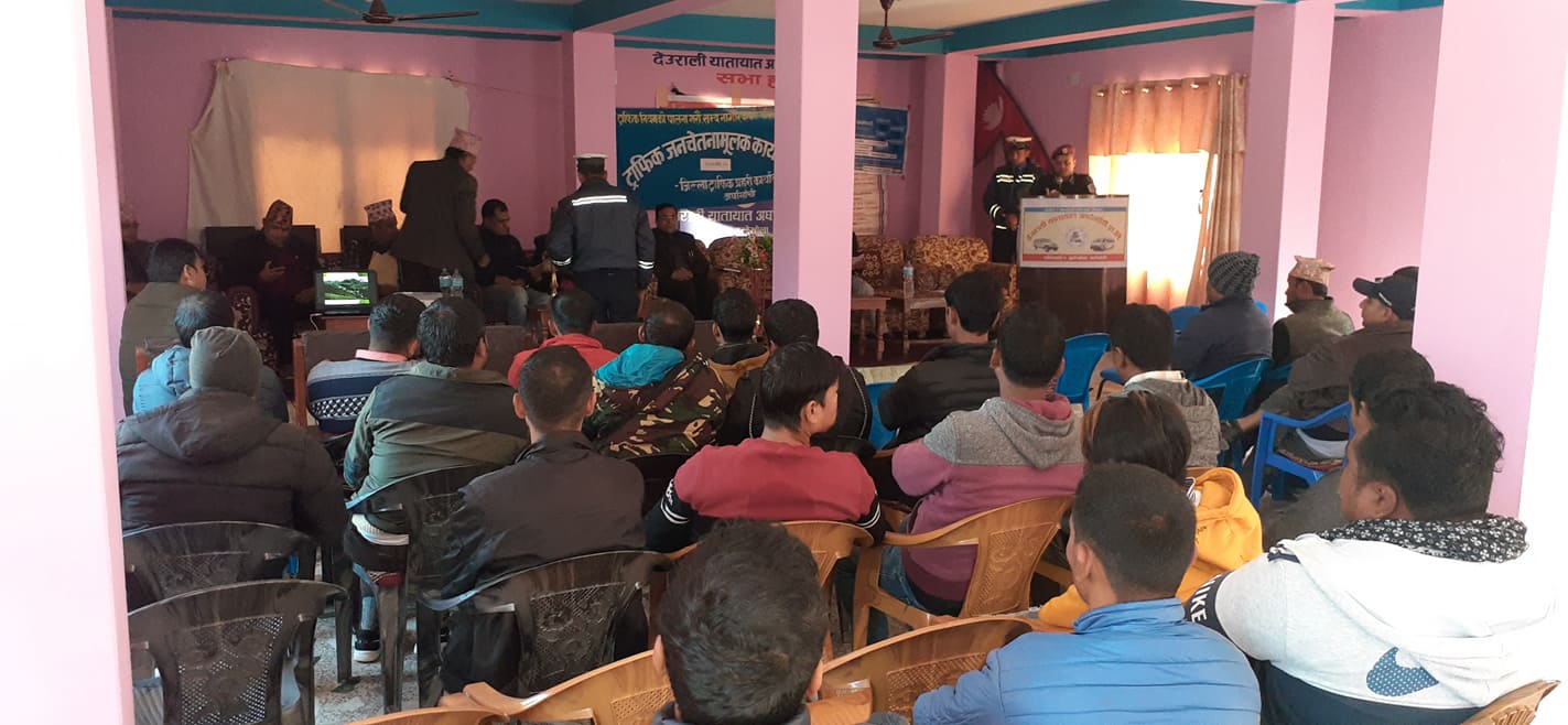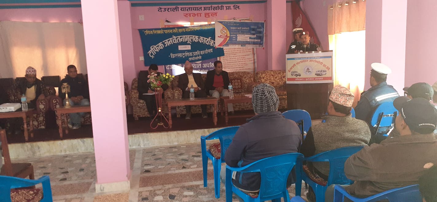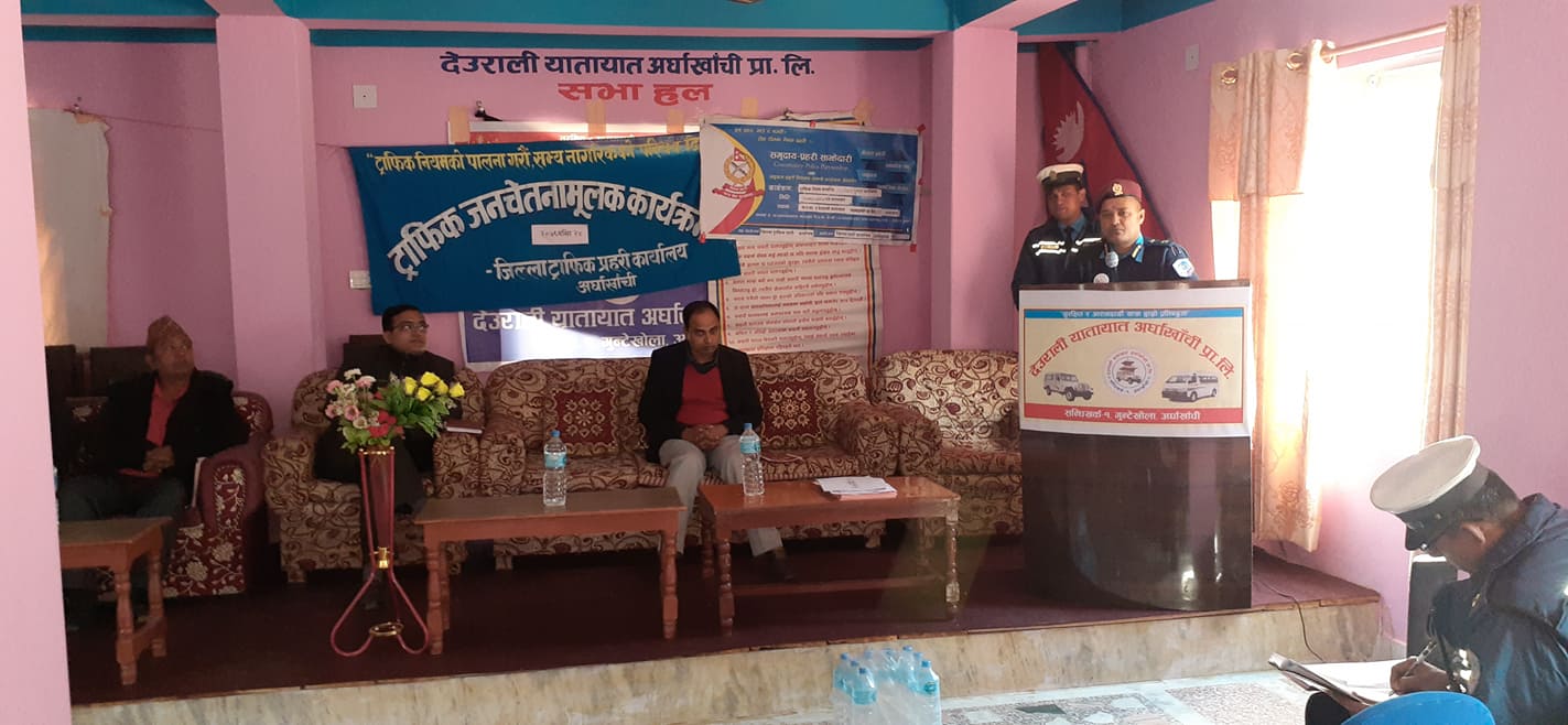 सन्धिखर्क नगरपालिका वडा नं. १ गुण्टेखोला स्थित देउराली यातायात प्रा.लि.को सभाहलमा अर्घाखाँची जिल्लामा संचालनमा रहेका विभिन्न यातायात प्रा.ली.हरुमा चालक तथा सहचालकहरु गरी ९० जना लाई दुर्घटना न्युनिकरण गर्ने उद्धेश्यले सवारी दुर्घटना हुन नदिन अपनाउनु पर्ने सतर्कता चालक, सहचालक तथा सवारी धनीको दायित्व र जिम्मेवारी कानुनी प्रावधान ट्राफिक नियम सम्बन्धी प्रशिक्षण कार्यक्रम सम्पन्न भएको हो ।