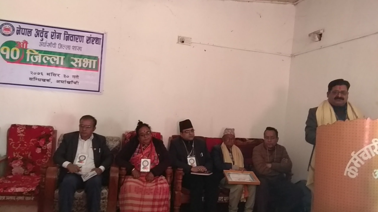 नेपाल अर्बुद रोग निबारण संस्था अर्घाखाँची को १०औं जिल्ला सभाको उदघाटन सत्र सन्धीखर्क मा सम्पन्न भएको छ। सन्धीखर्क नगरपालिका का नगर प्रमुख कमल प्रसाद भुसाल को प्रमुख आतिथ्यतामा सम्पन्न सभामा सन्धीखर्क नगरपालिका का उपप्रमुख ठाकुर कुमार बिक ,मालारानी गाउँ पालिकाकी उपाध्यक्ष प्रमिला क्षेत्री ,निमित्त प्रमुख जिल्ला अधिकारी बिष्णुराज बेल्बासे ,सनपा २ का वडा अध्यक्ष मोतीजङ रायमाझी ३ का वडा अध्यक्ष लिलाराम गौतम, ५ का वडा अध्यक्ष राजेन्द्र भुसाल १० का वडा अध्यक्ष लक्ष्मीनारायण चुदाली १ का कार्यबाहक अध्यक्ष लक्ष्मण पराजुली लगायतको उपस्थिति रहेको कार्यक्रम मा शुभकामना मन्तव्य राख्ने प्रमुख अतिथी लगायत अन्य अतिथी हरुले मुख्य गरि क्यान्सर रोग का कारण धेरै ले ज्यान गुमाउनु परेको भन्दै क्यान्सर रोग र यस्का रोगथाम का लागि सचेतना का कार्यक्रम हरु अघि बढाउनु पर्ने भन्दै यस्ता घाटक रोग हरुका विरुद्ध लडनको लागी सामुहिक कोष बनाइ त्यस्ता खाले बिरामी हरुका लागी उपचारमा सहयोग पुर्याउन सबैले हाते मालो गर्नु पर्ने बताएका थिए सेबा नै धर्म हो भन्ने उदेश्यले २०५८ सालमा स्थापना गरिएको यो संस्था ले आज अर्घाखाँचीमा आफ्नो १०औ जिल्ला सभा गर्दै छ।