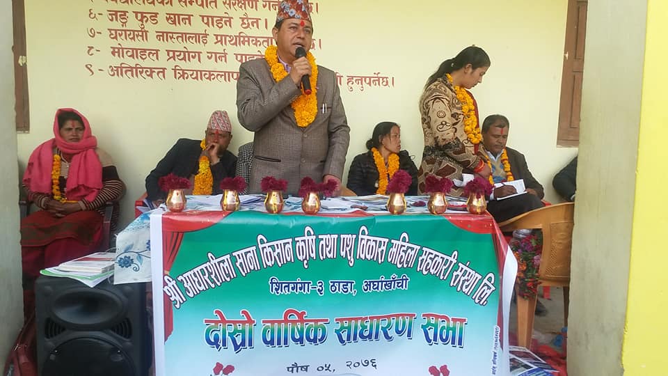ठाडा, अर्घाखाँची (अर्घाखाँचीडट्कम) । अर्घाखाँची जिल्लाको शितगंगा नगरपालिका वार्ड नम्बर ३ को ठाडामा आधारशिला सानाकिसान कृषि तथा पशु बिकास महिला सहकारी संस्थाको दोस्रो साधारणसभा सम्पन्न भएको छ ।