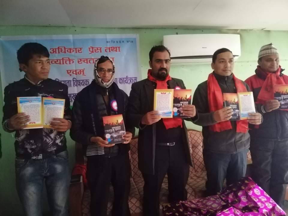 जनपत्रकार संगठनका केन्द्रीय अध्यक्ष प्रकाश डुम्रे , महासचिव हेम बिष्ट ,नेपाली कांग्रेसका जिल्ला उपसभापति शान्ता भण्डारी ,राष्ट्रिय जनमोर्चाका जिल्ला सल्लाहकार जिबनारायण कोईराला ,नेपाल वारएशोसिएसनका निबर्तमान जिल्ला अध्यक्ष केबी भुसाल ,पत्रकार महांघका जिल्ला अध्यक्ष हिमबहादुर जि.सी. लेकाली,मानवअधिकार तथा शान्ति समाजका जिल्ला सभापति असोक पौडेल ,पत्रकार महासंघका प्रदेश सदस्य शोभाखर पन्थी लगायतका बक्ताहरुले मन्तव्य राख्नुभएको कार्यक्रममा राजनीतिक दल,पत्रकार ,मानवअधिकारकर्मी ,कानुन ब्यबसायी लगायत विभिन्न संघ संस्थाका प्रतिनिधिहरुको उल्लेखनीय सहभागीता रहेको थियो । कार्यक्रम जनपत्रकार संगठनका जिल्ला अध्यक्ष अनिल नेपालीको अध्यक्षतामा सम्पन्न भएको थियो ।
