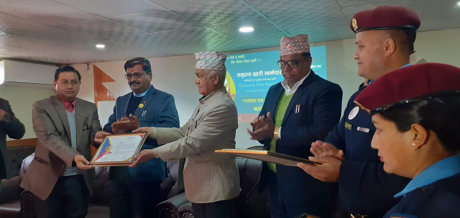 समुदाय प्रहरी साझेदारी कार्यक्रम अन्तर्गत सञ्चालन हुने लागु औषध तथा दुव्र्यसनी नियन्त्रण, आत्म हत्या न्युनीकरण, मानव वेचविखन लगायतका सचेतनामुलक कार्यक्रममा सहयोग गरेको भन्दै जिल्लाका तीन नगरपालिका र तीन गाउँपालिकालाइ सम्मान गरेको हो ।