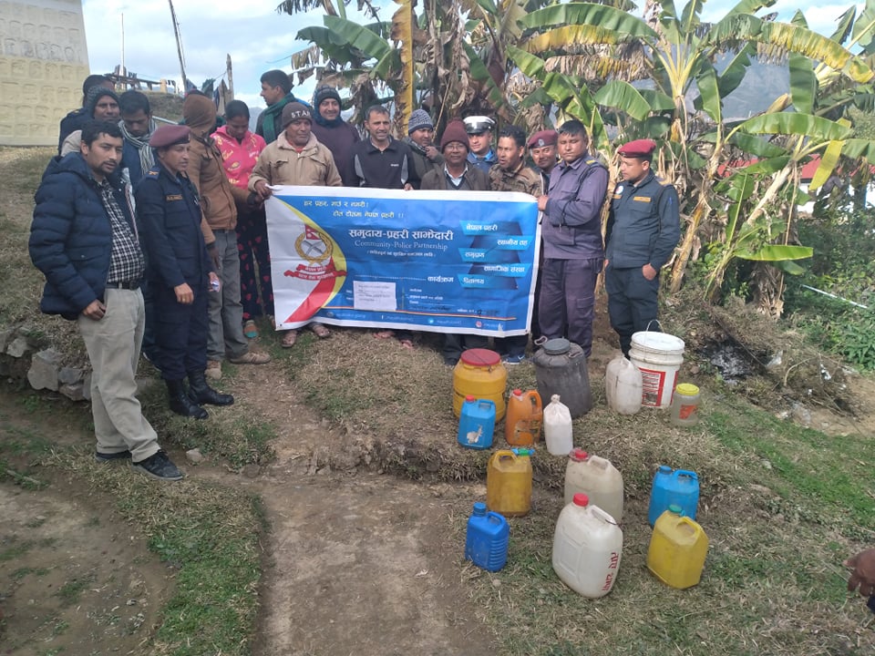 “समुदाय-प्रहरी साझेदारी कार्यक्रम” अनुसार ईलाका प्रहरी कार्यालय ठाडा अर्घाखाँचीबाट गस्ती डिउटी चेकिङमा खटिएको कार्यालय प्रमुख प्रहरी निरीक्षक बाबुराम बस्नेत समेतको प्रहरी टोलीले शितगंगा नगरपालिका वार्ड नं.२,३ र ४ का बिभिन्न होटलहरुमा बिक्रि बितरणका लागी राखिएको घरेलु मदिरा बरामद गरी नियन्त्रणमा लिई आज मंगलबार स्थानिय जनप्रतिनिधी,पत्रकार, समाजसेवी व्यक्तित्वहरुको रोहवर उपस्थितीमा ईलाका प्रहरी कार्यालय ठाडा कै कम्पाउण्ड भित्रै खाल्डो खनि नष्ट गरीएको थियो ।