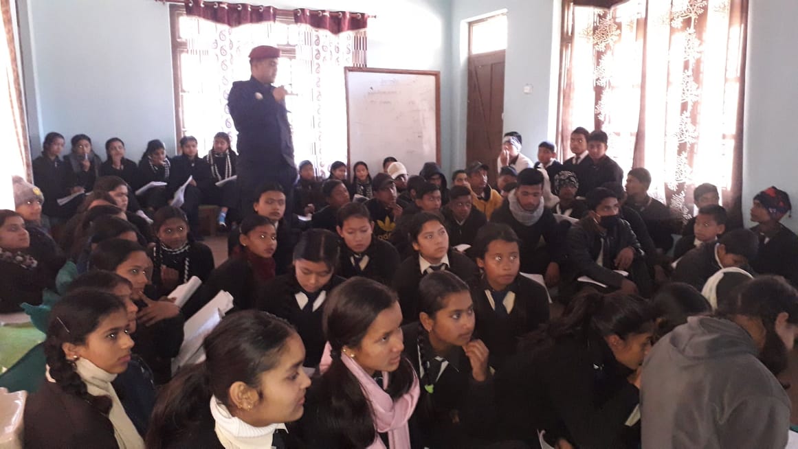 जिल्ला प्रहरी कार्यालय अर्घाखाँचीको आयोजनामा “समुदाय-प्रहरी साझेदारी”कार्यक्रम अनुसार “प्रहरी-बिद्यालय सम्पर्क कार्यक्रम”अन्तर्गत चुत्रावेशी स्थित श्री जनज्योती माध्यमिक बिद्यालयका कक्षा ९ र १० मा अध्ययनरत अं.७० जना छात्र-छात्रालाई प्र.स.नि.परमेश्वर यादबले अपराध पहिचान, रोकथामका उपायहरु र व्यक्तिगत जिम्मेवारी, लैङ्गिक हिंसा, बाल दुर्व्यबहार,लागु औषध तथा मादक पदार्थ : प्रकार, असर, बच्ने उपायहरु तथा कानूनी व्यबस्था, आधारभुत सुरक्षा, सडक सुरक्षा, साईवर सुरक्षा, प्रहरीलाई अबर गर्ने अवस्था र १०० नम्वरको प्रयोग, आधारभुत कानुन र मानव अधिकार सम्बन्धी बिषयमा सचेतनामुलक प्रशिक्षण दिनु भएको थियो ।