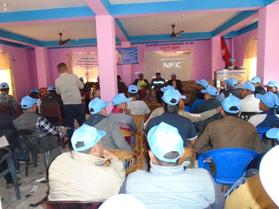 देउराली यातायात अर्घाखाँची प्रा.लि. का अध्यक्ष योगेन्द्र वहादुर खड्काको अध्यक्षता र प्रा.लि. का सदस्य सचिव प्रेम प्रकाश पाण्डेको सञ्चालनमा सम्पन्न कार्यक्रममा भौतिक पुर्वाधार तथा यातायात मन्त्रालय सडक सुरक्षा तथा ट्राफिक सुरक्षा विज्ञ निरज धौवडेल ,सरोज खनाल ,जिल्ला ट्राफिक प्रमुख खेमानन्द काफ्ले लगायतले सडक सुरक्षा सम्वन्धि प्रशिक्षण दिनुभएको थियो ।