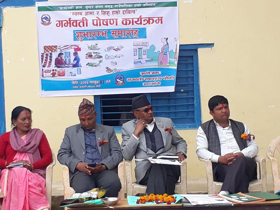 भगवतीको स्वास्थ्य चाैकी प्रागंणमा शुक्रबार गर्भवति पाेषण कार्यक्रम शुभारम्भ कार्यक्रम सम्पन्न भएको हो ।  कार्यक्रमको छत्रदेव गाउँपालिकाका उपाध्यक्ष तुल्सादेवी श्रेष्ठले उद्धघाटन गर्नु भएको थियो ।