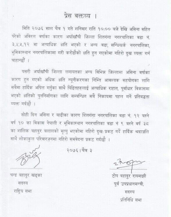 प्रतिनिधी सभाका सदस्य टोपबहादुर रायमाझी र राष्ट्रिय सभाका सदस्य चन्द्रबहादुर खड्का उज्जवलले सोमबार संयुक्त प्रेस बिज्ञप्ती जारी गर्दै अन्न बाली संगै भएको भौतिक क्षतिको अधिकतम राहत र क्षतिपूर्ति दिलाउन पहल गर्ने उल्लेख गर्नु भएको छ ।
