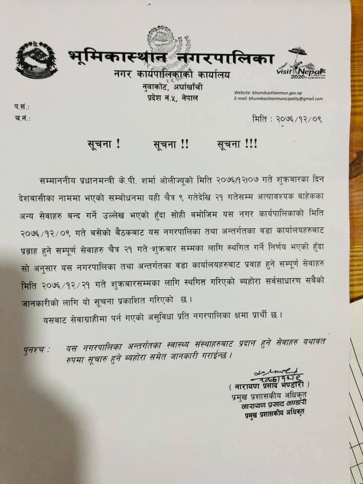 नुवाकोट, अर्घाखाँची । अर्घाखाँची जिल्लाको  भूमिकास्थान नगरपालिकाले कोरोना भाईरस संक्रमण जोखिम बढेको भन्दै सम्पूर्ण सेवा बन्द गरेको छ ।