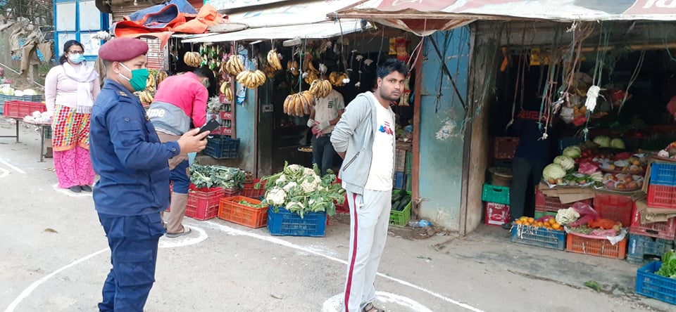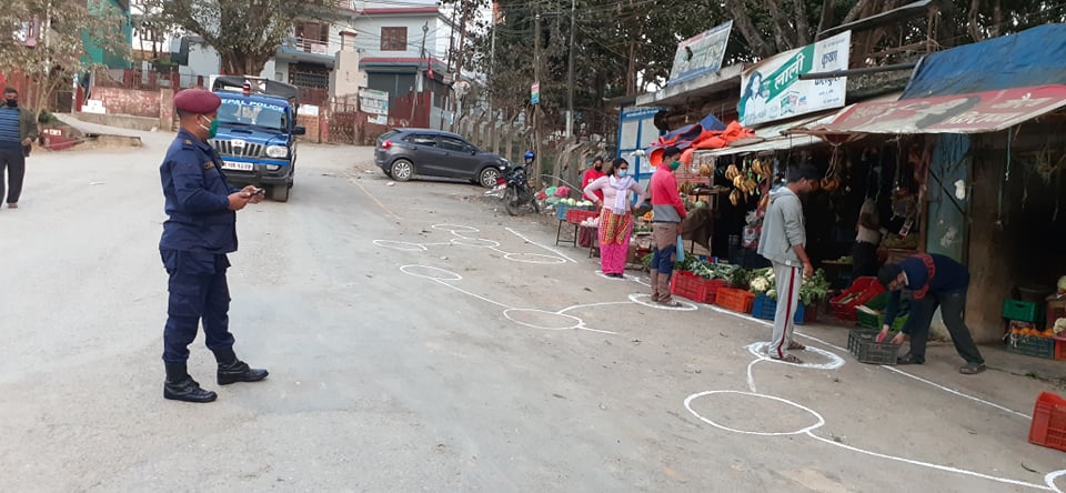 हाल विश्वव्यापी महामारीको रुपमा फैलिएको कोरोना भाईरस ( COVID-19) सङक्रमणबाट बच्नको लागि दैनिक उपभोग्य सामानहरु खरिद तथा विक्री गर्दा क्रेता तथा विक्रेताहरु बिच सन्धिखर्क बजारमा एक आपसमा सामाजिक दुरी कायम गर्न प्रमुख प्रहरी नायव उपरीक्षक प्रकाश बिष्ट सहितको प्रहरी टोलीले सहजीकरण गर्नुभएको थियो ।