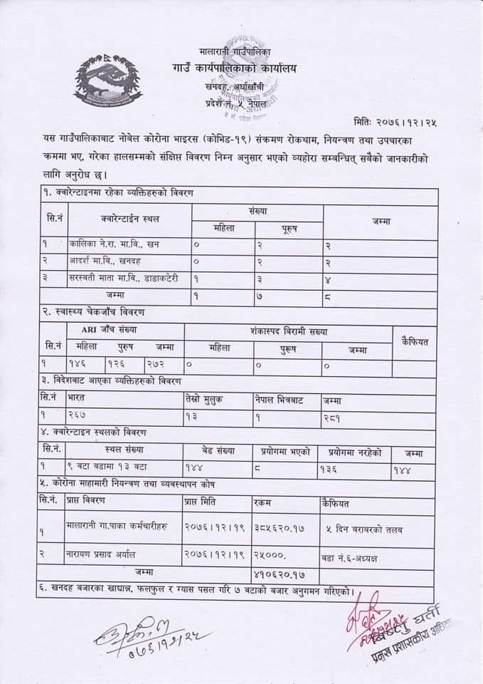 मालारानी गाउँपालिकामा अहिलेसम्म ८ जना क्वारेन्टाइनमा, २७२ जनाको एआरआई स्वास्थ्य जाँच (पुरा विवरण सहित)