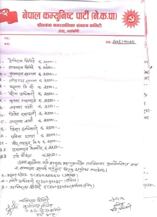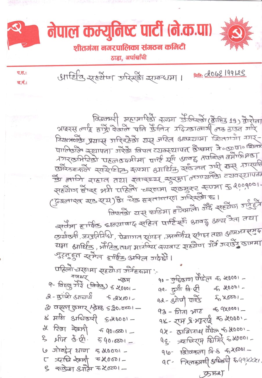 साथै अन्य रकम समेत संकलन गरि नगरपालिकाको राहतकोष्मा जम्मा गर्ने प्रतिवद्धता ब्यत गर्नुभयो । आन नगरपालिकाको कार्यालयमा पुगि नगर प्रमुख सुर्य प्रसाद अधिकारीलाइ उत्त चेक हस्तान्त्रण गरिएको हो । नेकपाले नेकपाका जनप्रतिनिधी, नगरकमिटी ,जिल्ला कमिटी, सक्रिय सखस्य लगायत सँग सयोग संकलन गरि राहतको लागि उत्त रकम सहयोग गरेको सचिव मणिराम अधिकारीले जानकारी दिनु भयो ।