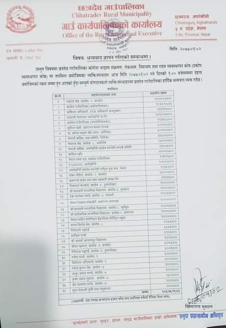 छत्रदेव गाउँपालिकाका प्रमुख प्रशासकिय अधिकृत खिमान्द भुसालले अर्घाखाँचीडट्कमलाई जानकारी गराए अनुसार राहत कोषको अहिलेसम्म १० लाख ५७ हजार ५ सय १९  रुपैया जम्मा भएको हो ।