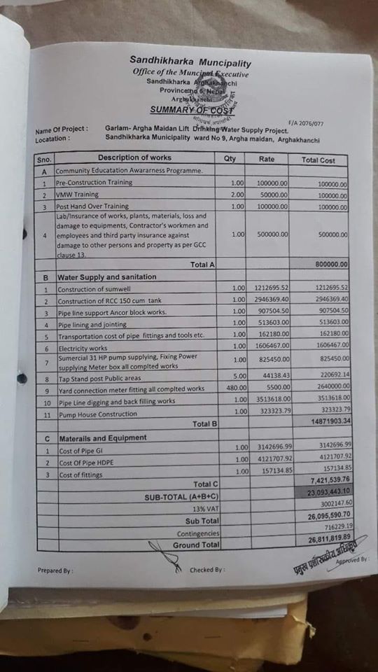 गर्लाम-मैदान लिफ्ट खानेपानी याेजनाको लगत स्टिमेट अनुसार पहिला नै टेन्डर प्रकृया समेत सम्पन्न थियो । लुम्बिनी अर्घाखाँची जेभि कन्ट्रक्सन प्रा.लिलाई ठेक्का परेकाे थियो । चालू आ.व २०७६/०७७ मा सन्धिखर्क नगरकार्यापालिकाबाट रु २६८११८१९.८९ पैसा बजेट विनियोजन भएकाे थियो ।