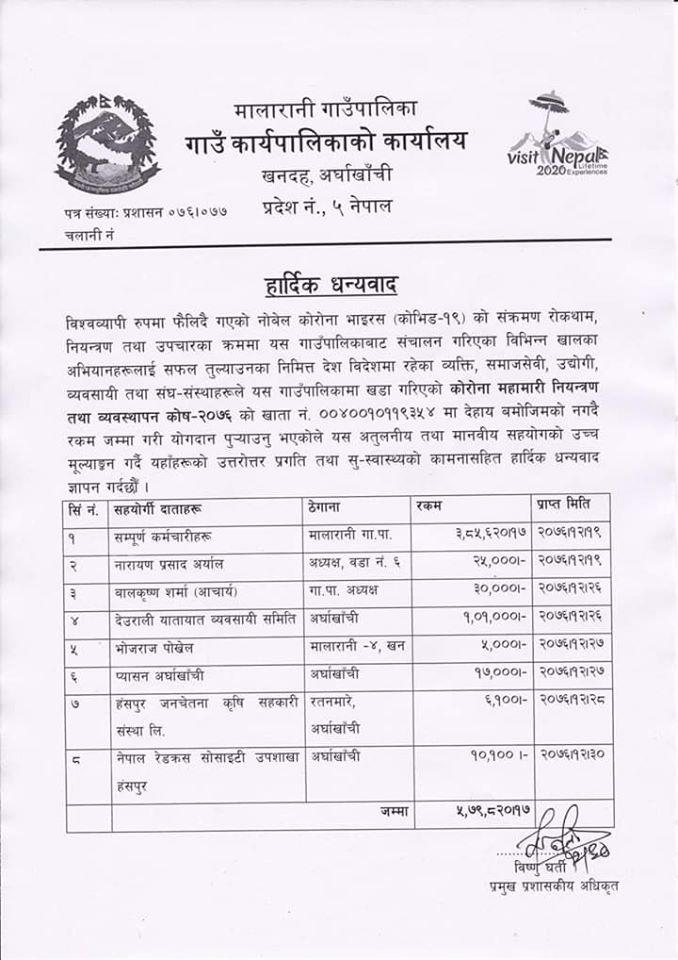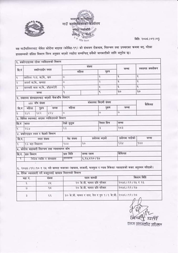 मालारानी गाउँपालिकाको राहत कोषमा विभिन्न व्यक्ति, संघ- संस्थाबाट अहिलेसम्म ६ लाख १४ हजार ८ सय २० रुपैया जम्मा भएको हो । यस्तै मालारानी गाउँपालिकामा अहिलेसम्म १२९ परिवारलाई २० किलोको दरले राहत वितरण गरेको छ ।