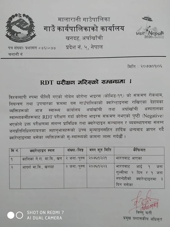 खन, अर्घाखाँची (अर्घाखाँचीडट्कम) । अर्घाखाँची जिल्लाको मालारानी गाउँपालिकाका दुई वटा क्वारेण्टाइनमा रहेका ४ जनाको र्यापिड डाइग्नोष्टिक टेस्ट (आरडीटी) टेस्ट नेगटिभ आएको छ ।