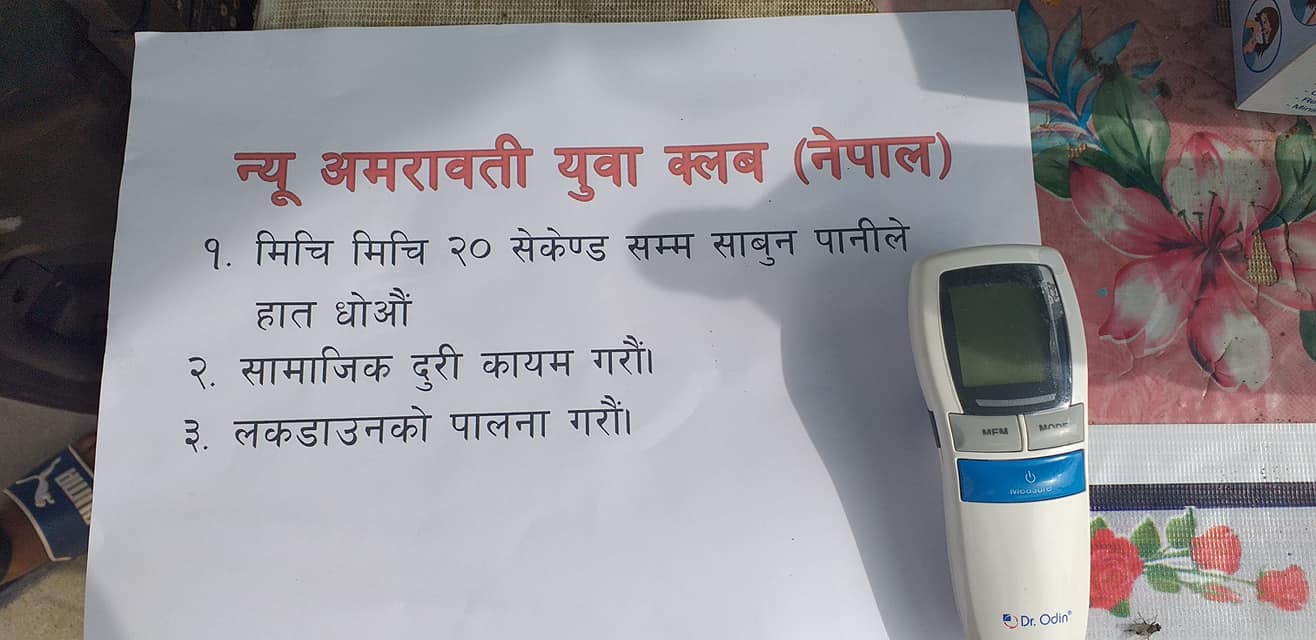 काेराेना भाइरस (काेभिड १९) बाट बच्नका लागि न्यू अमरावती युवा क्लबले विभिन्न काम गर्दै आएकाे छ । जनचेतनाका लागि विभिन्न पर्चा, पम्पेलेट, स्वास्थ्य परिक्षण तथा टाढाबाट आउने पैदल यात्रीहरुका लागि खाजाकाे व्यवस्था समेत गरेकाे छ ।