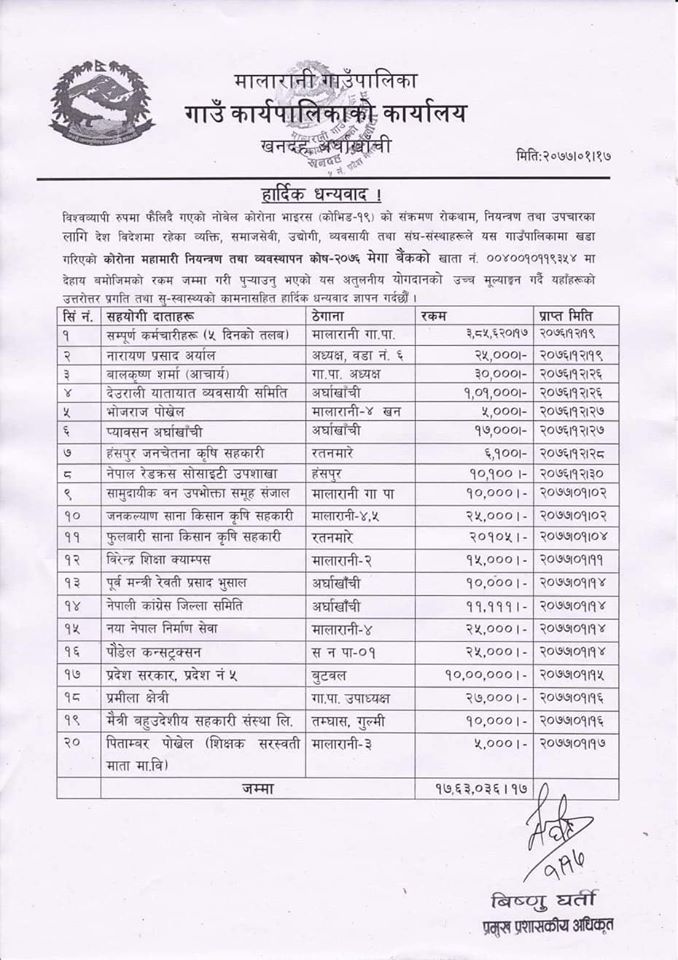 खन, अर्घाखाँची (अर्घाखाँचीडट्कम) । अर्घाखाँची जिल्लाको मालारानी गाउँपालिकाको राहत कोषमा अहिलेसम्म १७ लाख ६३ हजार ३६ रुपैया जम्मा भएको छ ।