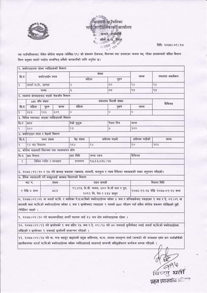 मालारानी गाउँपालिकाको राहत कोषमा विभिन्न व्यक्ति, संघ- संस्थाबाट अहिलेसम्म १७ लाख ६३ हजार ३६ रुपैया जम्मा भएको हो । यस्तै मालारानी गाउँपालिकामा अहिलेसम्म १२९ परिवारलाई २० किलोको दरले राहत वितरण गरेको छ ।