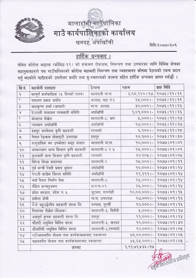 खन, अर्घाखाँची (अर्घाखाँचीडट्कम) । अर्घाखाँची जिल्लाको मालारानी गाउँपालिकाको राहत कोषमा अहिलेसम्म १ करोड ११ लाख ७१ हजार ५ सय ३६ रुपैयाँ जम्मा भएको छ ।