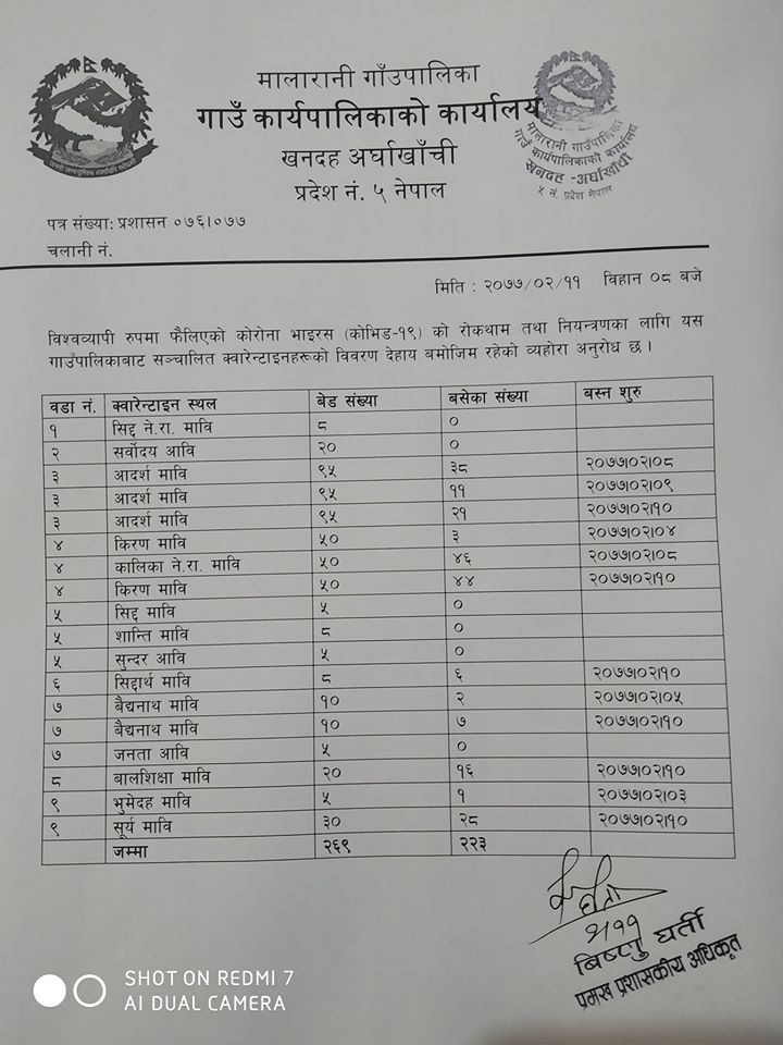 खनदह, अर्घाखाँची (अर्घाखाँचीडट्कम) । अर्घाखाँची जिल्लाको मालारानी गाउँपालिकाका स्थानिय तहका ९ स्थलका क्वारेन्टाइनमा भारतबाट आएका ३२० जनालाई व्यवस्थापना गरिएको छ ।