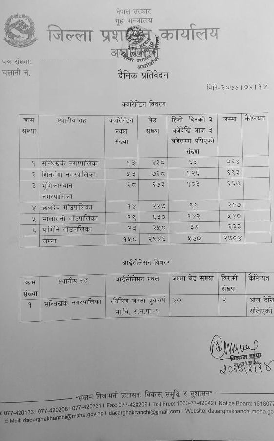 जिल्लाको सन्धिखर्कका क्वारेन्टाइनमा ३६४ शितगंगा नगरपालिकाका क्वारेन्टाइनमा -६९३ भुमिकास्थानका क्वारेन्टाइनमा ६६७, छत्रदेवका क्वारेन्टाइनमा २०७, मालारानीका क्वारेन्टाइनमा ५४० पाणिनीका क्वारेन्टाइनमा २३३ र सन्धिखर्कको हटारी आईसाेलेशनमा पालिका २ जना रहेका छन् ।