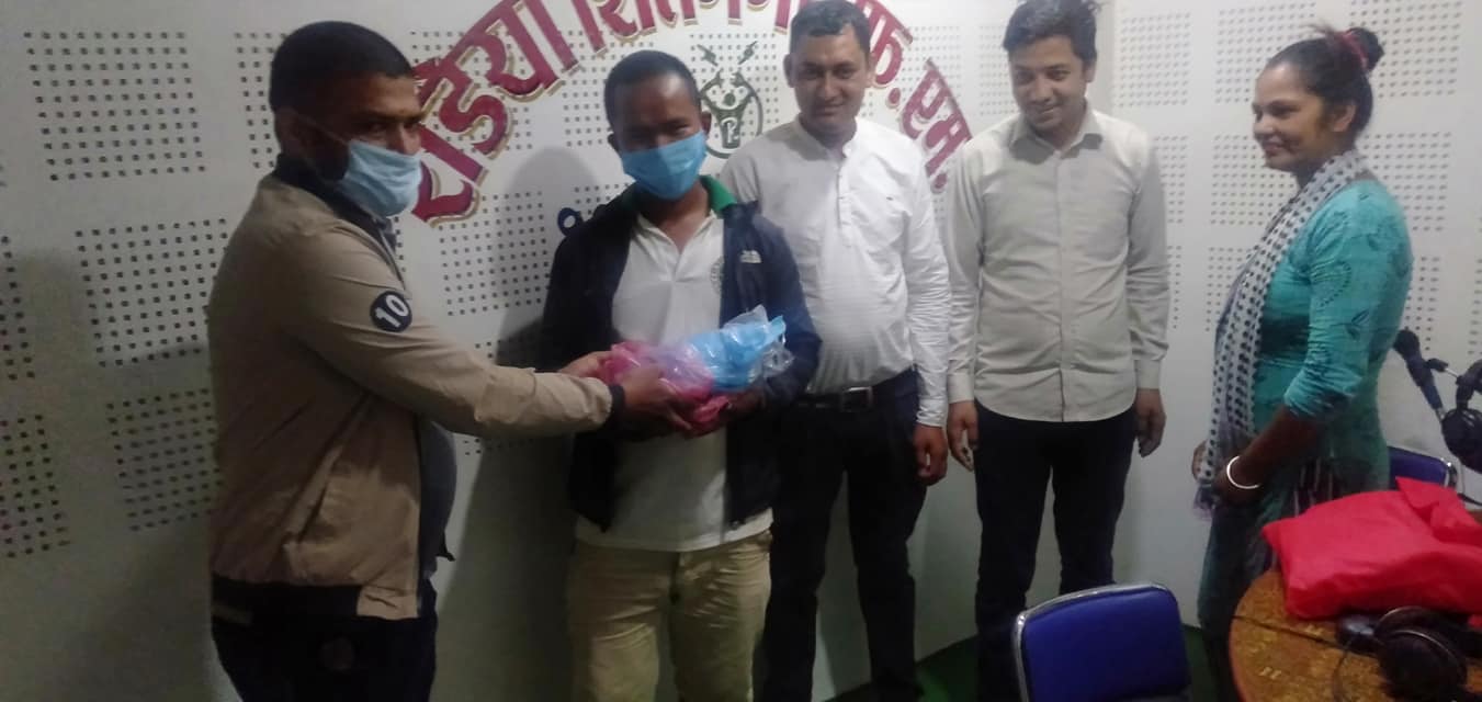 आज रेडियो शितगंगाको बार्षिक उत्षवको अबसरमा रेडियो शितगंगामा पुगि सेयर सदस्य अर्जुन बुढा तथा सञ्चारकर्मीहरु लाई मास्क र सेनिटाइजर गोल्पस हस्तान्तरण गर्नु भएको हो । शुरक्षा निकाय र सञ्चार क्षेत्रको माध्यम बाट जोखीम मोलेर काम गर्नु पर्ने भएकाले पनि सहयोग गरेको भट्टराइले बताउनु भयो ।