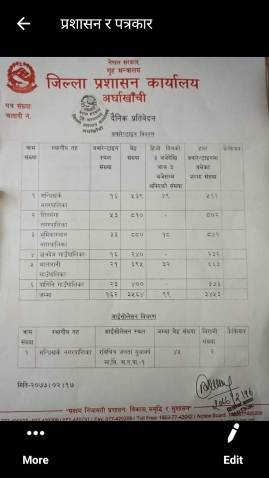 जिल्लाको सन्धिखर्कका क्वारेन्टाइनमा ५१२, शितगंगा नगरपालिकाका क्वारेन्टाइनमा ८०२ भुमिकास्थानका क्वारेन्टाइनमा ८७१ छत्रदेवका क्वारेन्टाइनमा २३२, मालारानीका क्वारेन्टाइनमा ६६३, पाणिनीका क्वारेन्टाइनमा ३७३ र सन्धिखर्कको हटारी आईसाेलेशनमा पालिका २ जना रहेका छन् ।