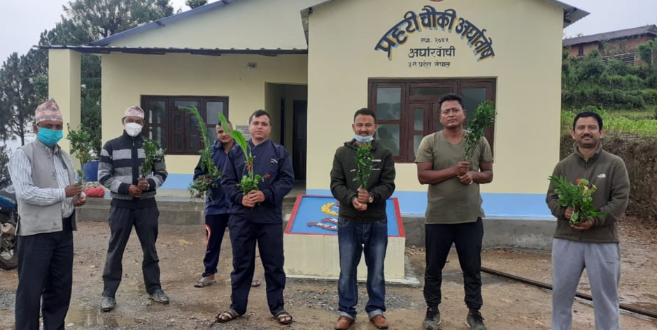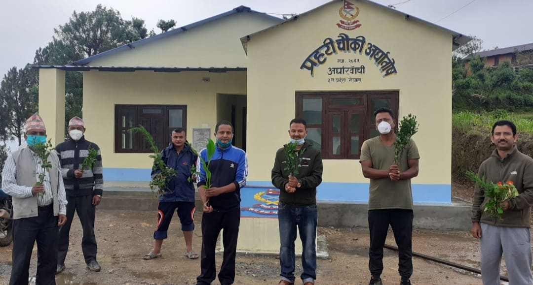 छत्रदेव, अर्घाखाँची (२४ जेष्ठ २०७७, शनिबार) । अर्घाखाँची जिल्लाको छत्रदेव गाउँपालिका वार्ड नम्बर ८ अर्घातोषमा बनेको नव निर्मित प्रहरी चौंकी कार्यालय परिसरमा विभिन्न प्रकारका फुलहरु ल्याएर वृक्ष रोपण गरिएको छ।