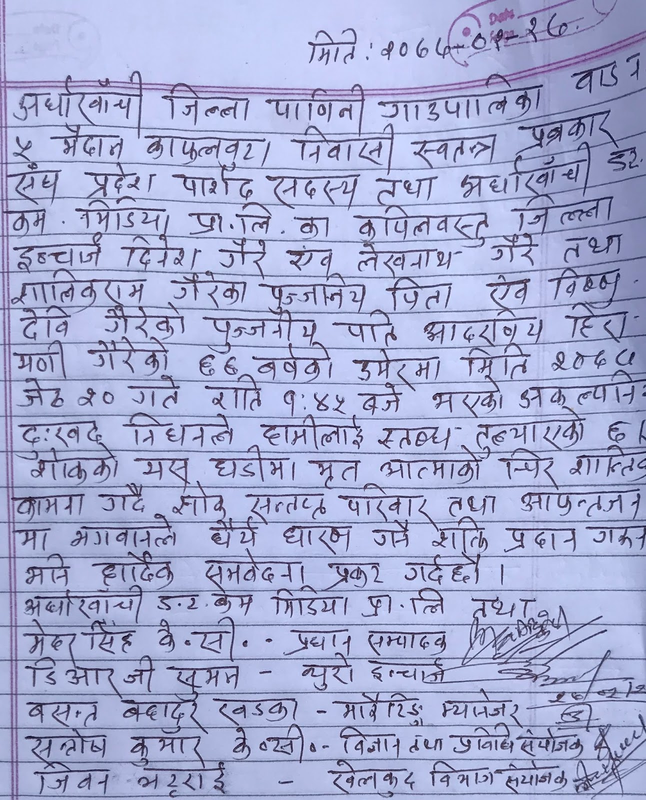 पाणिनी गाँउपालिका वडा न. ५ काफलवुटा स्थित निवीसमा पुगेर अर्घाखाँची मीडिया हाँउस प्रालीद्धारा संचालित अर्घाखाँचीडट्कमका फ़ाउन्डर/प्रकाशक -प्रधान सम्पादक मेहर सिंह के.सी, समाचार सम्पादन-अन्तराष्ट्रीय विभाग तथा व्युरो प्रमुख डिआरजी सुमन, विज्ञान तथा प्रविधि संयोजक संतोषकुमार के.सी,बजार व्यस्थापन सन्योजक/प्रमुख बसन्त बहादुर खड्का ,खेल संयोजक जीवन भट्टराईको उपस्थितीमा मृतक प्रति चीर शान्तिको कामना गर्दै शोकाकुल घरपरिवार प्रति हार्दिक समवेदना प्रकट गरिएको थियो ।