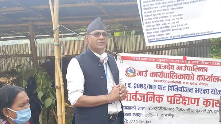 गाउँपालिकाले बुधबार मात्रै छत्र एग्रीकल्चर डेभलपमेन्ट कम्पनी प्रालि छत्रदेब गाउँपालिका वार्ड नं ५ दामलिङ अर्घाखाचीले स्थानीय पूर्वाधार कार्यक्रम मार्फत सञ्चालन गरेकाे याेजनाकाे सामाजिक दुरि कायम गरि सार्वजनिक सुनुवाई सम्पन्न गरेकाे समेत भुसालले जानकारी दिनु भयो ।