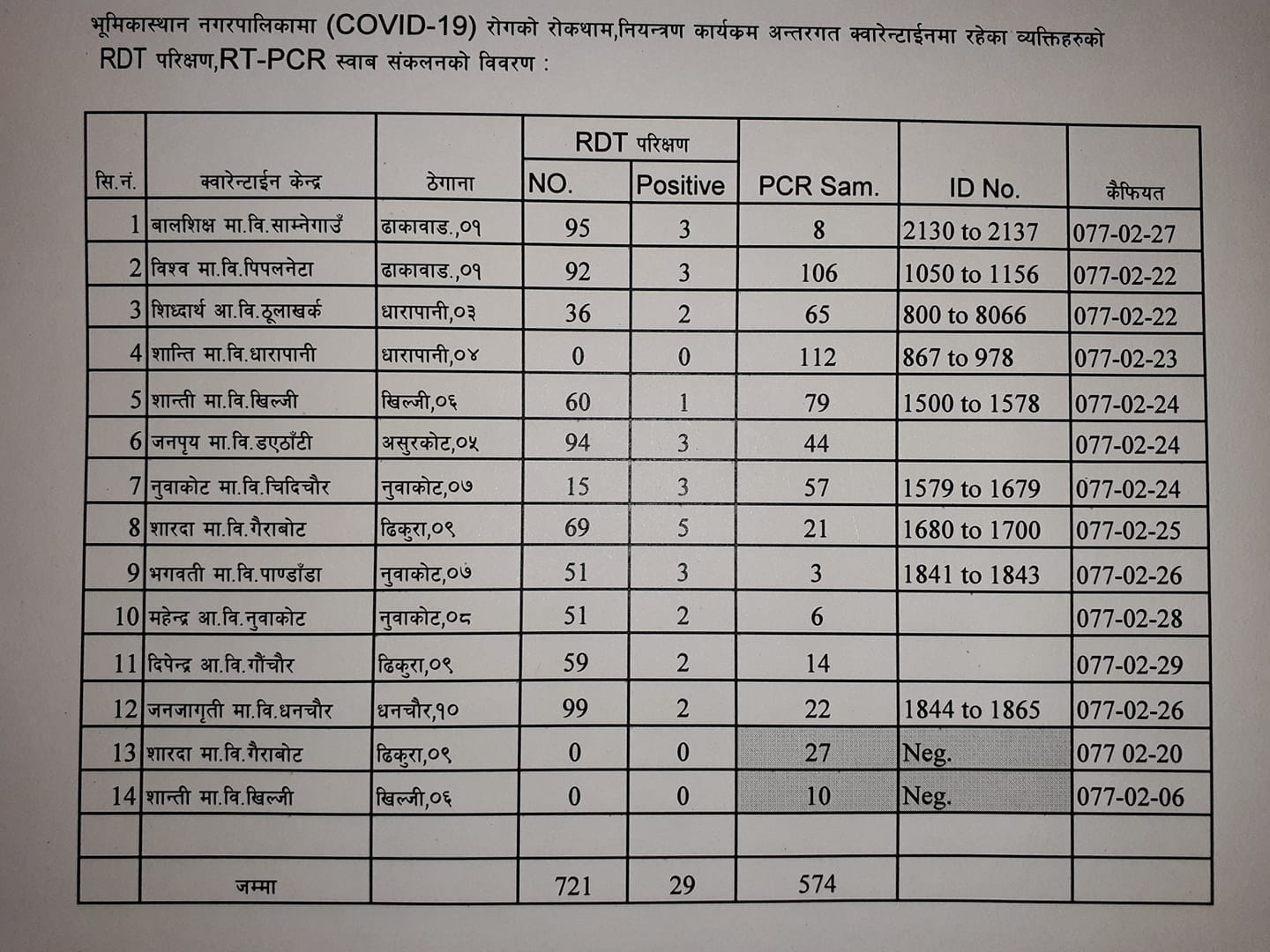 यसघि गत ज्येष्ठ ३० गते शुक्रवार शितगंगा नगरपालिकाको वार्ड नं. १ सुवर्णखालको महेन्द्र आधारभुत विधालय क्वारेन्टाइनमा बसेका १९ वर्षिय एक जनामा ब्यक्तिको पिसिआर रिर्पोट पोजेटिभ आएको थियो ।