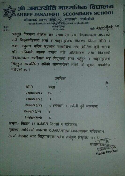 श्री जनज्योती माविले नेपाल सरकार मन्त्रीपरिषदको जेठ २८ गतेको निर्णय र जिल्ला प्रशासन कार्यालय अर्घाखाँचीको जेठ ३० गतेको सूचना अनुसार असार १ गतेदेखि सम्पुर्ण सरकारी कार्यालय लगायत शिक्षण संस्थाका कार्यालयहरु खुला रहने भनी गरिएको निर्णय बमोजिम असार २ गतेदेखि पुस्तक वितरण कार्यको आरम्भ गरेको छ।