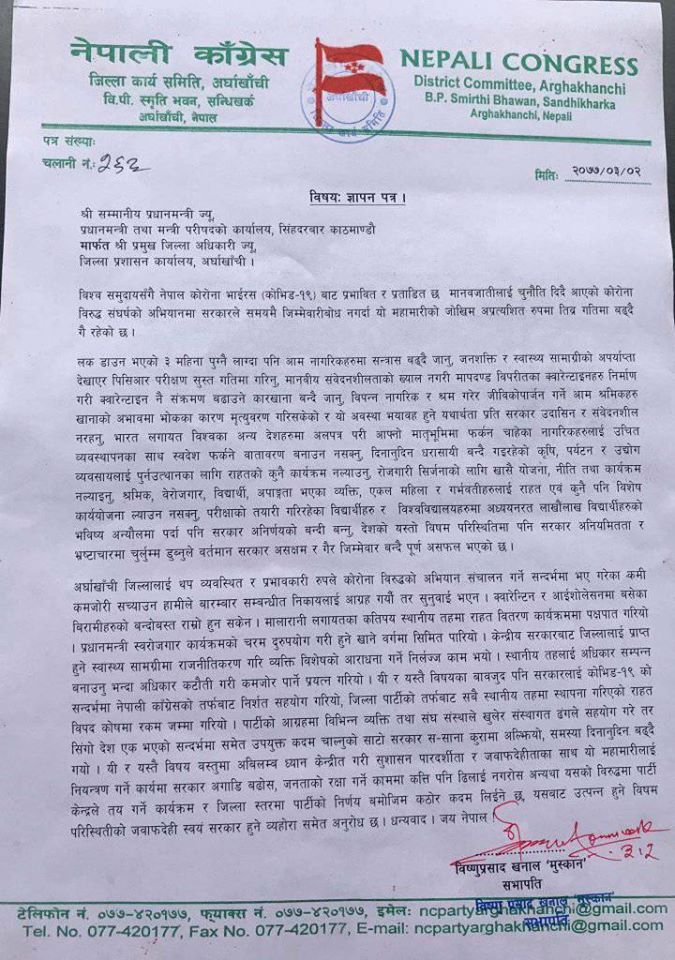 नेपाली काङ्ग्रेस जिल्ला सभापती बिष्णु प्रसाद खनाल मुस्कान , उपसभापति शान्ता भण्डारी , तरुण दल जिल्ला अध्यक्ष नारायण खड्का ,नेपाल बिद्यार्थी संघ जिल्ला अध्यक्ष भरत भट्टराई लगायतको टोलीले सरकारले कोरोना नियन्त्रणमा देखाएको उदासिनता , मुलुकमा भएका पछिल्ला जघन्य अपराध , जातिय भेदभाव , भस्ट्राचार जस्ता गतिविधि एवं अमानवीय ब्यबहारहरु तत्काल बन्द गर्न भन्दै प्रमुख जिल्ला अधिकारी बिजय राज पौडेल मार्फत प्रधानमन्त्रीलाई ज्ञापन पत्र बुझाएको हो ।