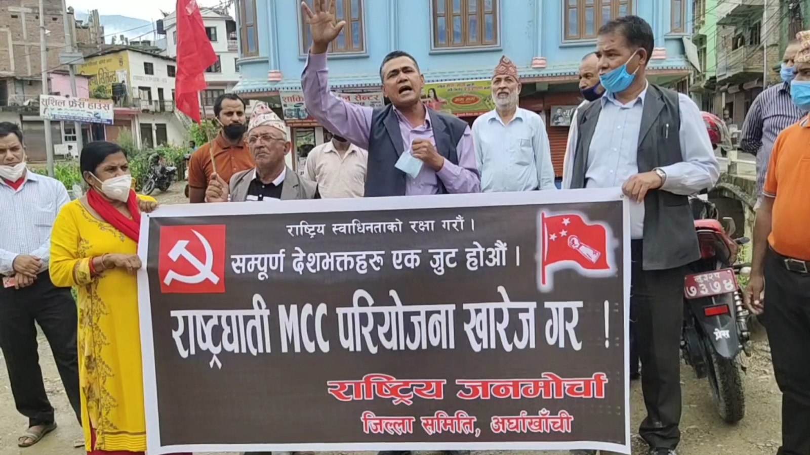 चुत्राबेसी, अर्घाखाँची (अर्घाखाँचीडट्कम) । अर्घाखाँची जिल्लाको सदरमुकाम सन्धिखर्कमा नेकपा मसाल निकट राष्ट्रिय जनमोर्चाले अमेरिकी परियोजना मिलेनियम च्यालेन्ज कर्पोरेसन (एमसीसी) को विरोधमा प्रदर्शन गरेको छ ।