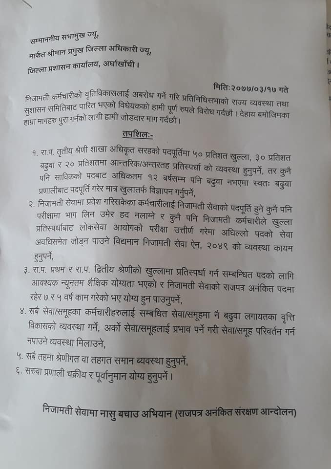 अर्घाखाँचीमा बिभिन्न कार्यालयमा कार्यरत नासु तथा अन्य गरि ३३ जना राष्ट्रसेवक कर्मचारीकाे हस्ताक्षर संकलित ज्ञापन पत्रमा प्रदेश निजामती सेवा तथा स्थानीय सेवाकाे मार्ग दर्शक एेनकाे रूपमा रहेकाे संघिय निजामती सेवा ऐेनकाे प्रस्तावित मस्यौदामा रहेका केही बिषयमा गम्भीर असहमति प्रकट गरिएकाे छ ।
