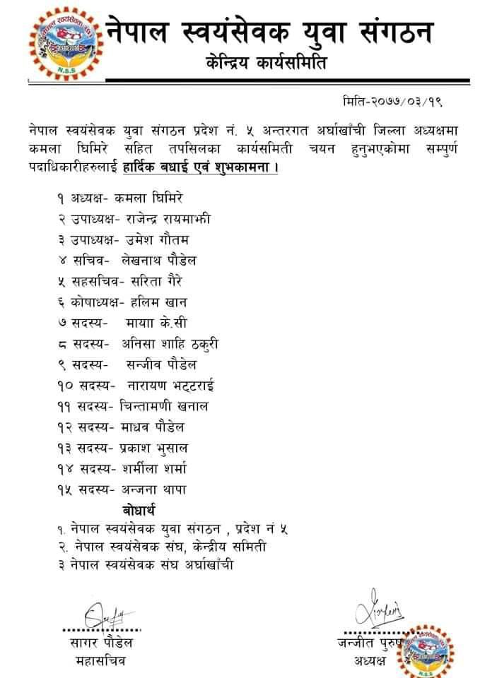 सन्धिखर्क, अर्घाखाँची । नेपाल स्वयंसेवक संघ युवा संगठन अर्घाखाँचीको अध्यक्षमा कमला घिमिरे चयन भएकी छिन् । सामाजिक क्षेत्रमा काम गर्ने युवाहरुको साझा संगठनका रुपमा रहेको यस संस्थामा घिमिरेको नेतृत्वमा १५ सदस्यीय नेतृत्व चयन भएको हो ।