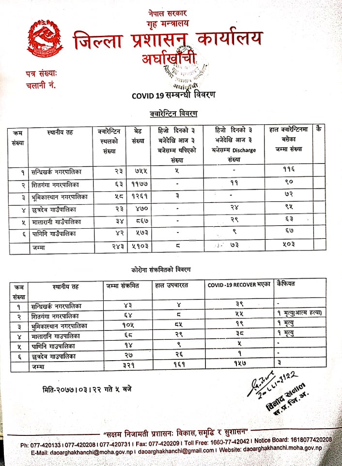 अर्घाखाँचीका ६ वटा स्थानिय सरकारले २ सय ४३ स्थानमा ५ हजार १ सय ३ वटा बेड सहितको क्वरेन्टीन स्थापना गरि भारत लगायत तेस्रो मुलकबाट आएकाहरुलाई क्वरेन्टीनमा राख्ने गरेका छन । सोमबारसम्म जिल्लाका बिभिन्न स्थानका आईसोलेशनमा १६२ जना संक्रमितहरु उपचाररत रहेको जिल्ला प्रशासन कार्यालय अर्घाखाँचीले जनाएको छ ।