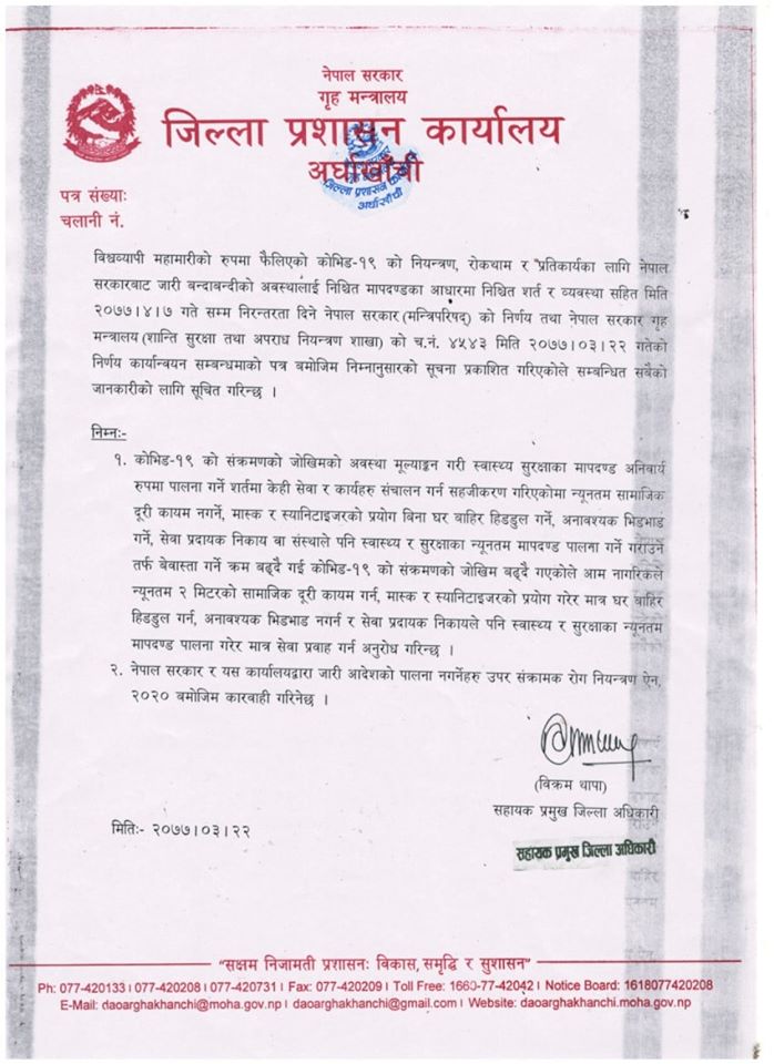 जिल्ला प्रशासन कार्यालय अर्घाखाँचीका अनुसार मास्क नलगाई हिँड्ने र सामाजिक दूरी कायम नगर्नेलाई संक्रमण रोग ऐन २०२० अनुसार कारबाही गरिने छ ।
