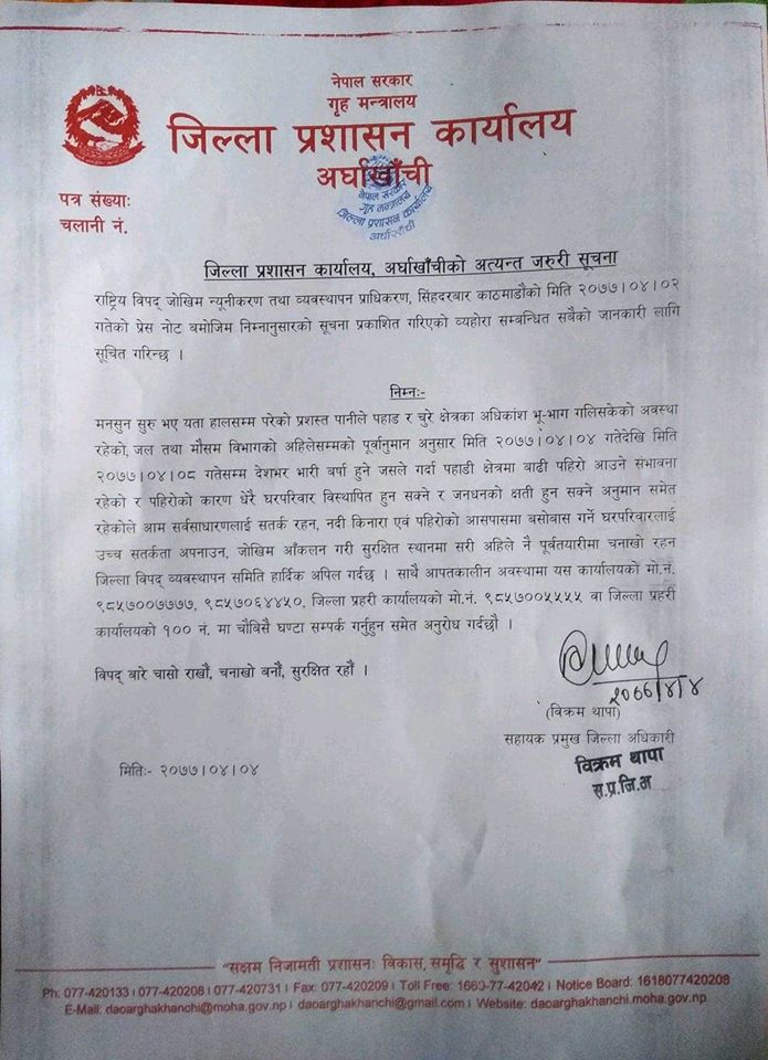 जिल्ला प्रशासन कार्यालय अर्घाखाँचीले एक सुचना जारी गर्दै आगामी ४ दिन अर्घाखाँची जिल्ला लगायत देशभर लगातार वर्षा हुने भएकोले सर्वसाधारणलाई सचेत रहन गरेको हो ।