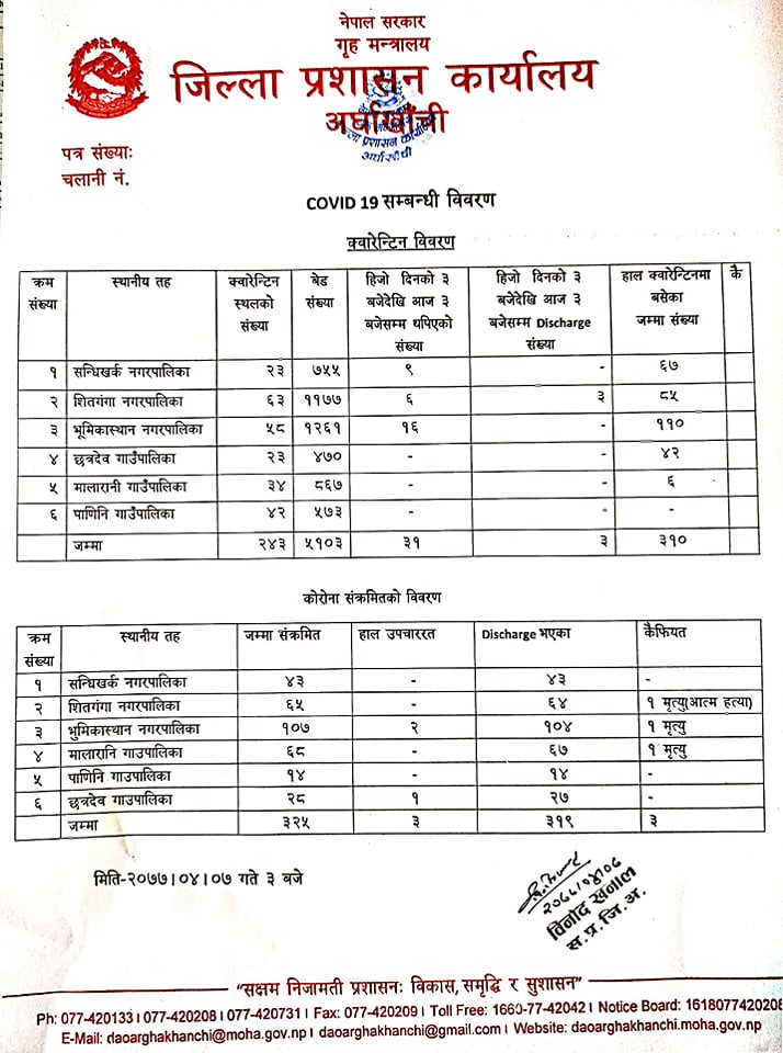सन्धिखर्क, अर्घाखाँची (अर्घाखाँचीडट्कम) । अर्घाखाँचीमा बुधवारसम्म ३१९ जनाले कोरोना जितेर घर फर्केका छन् । भने ३ जना उपचाररत छन् ।